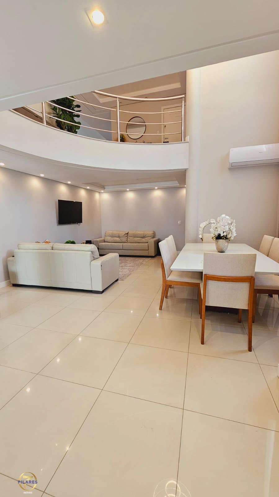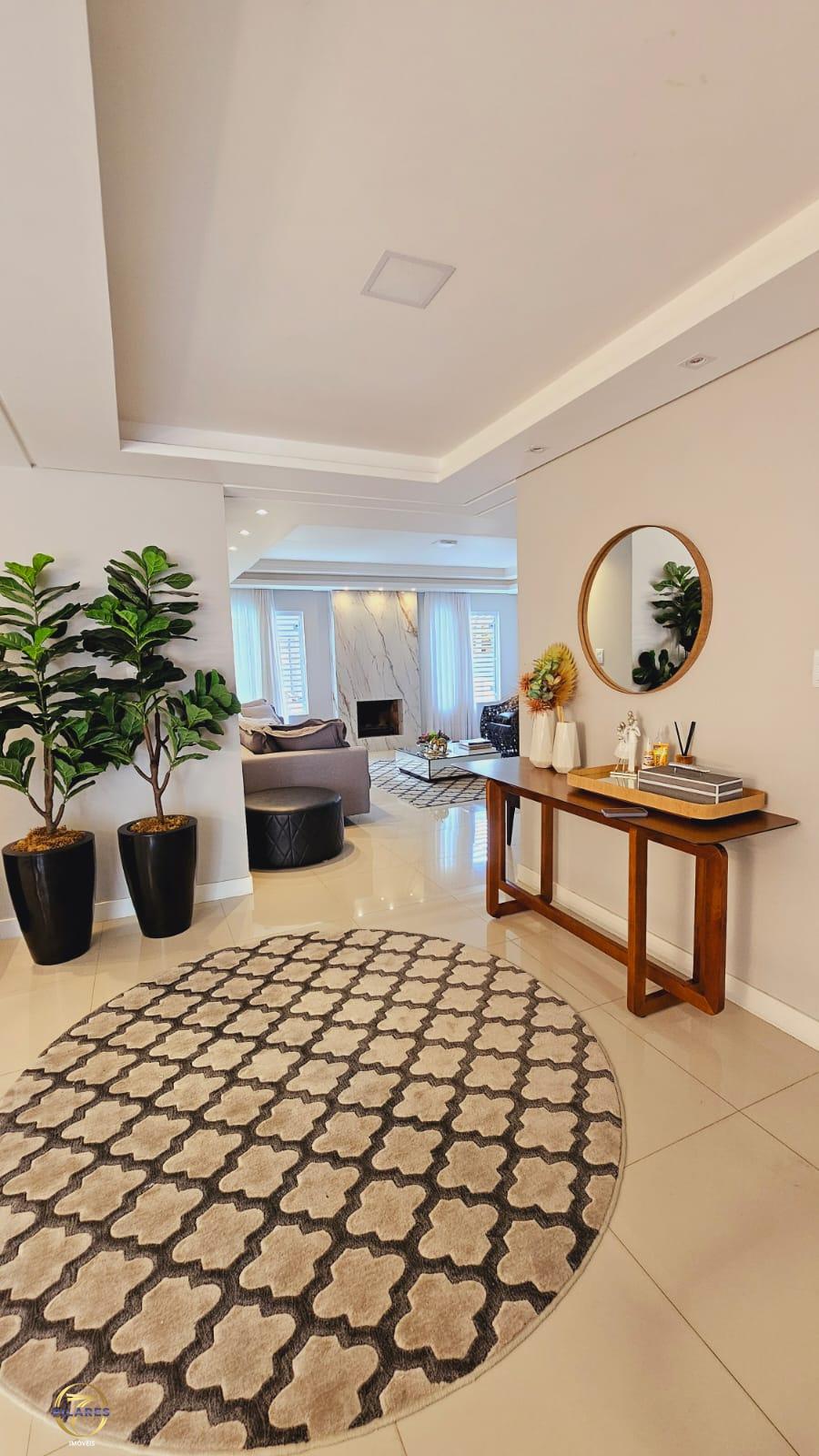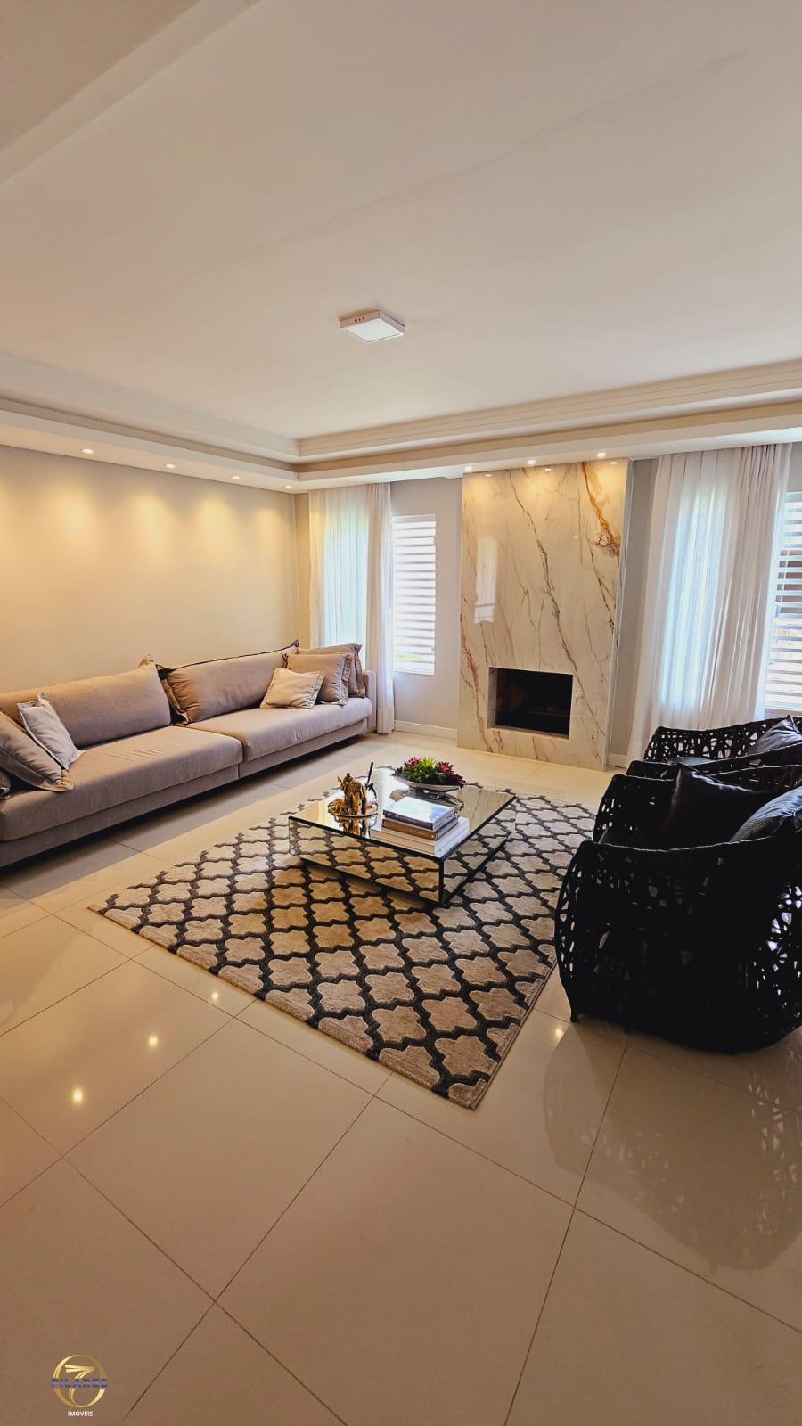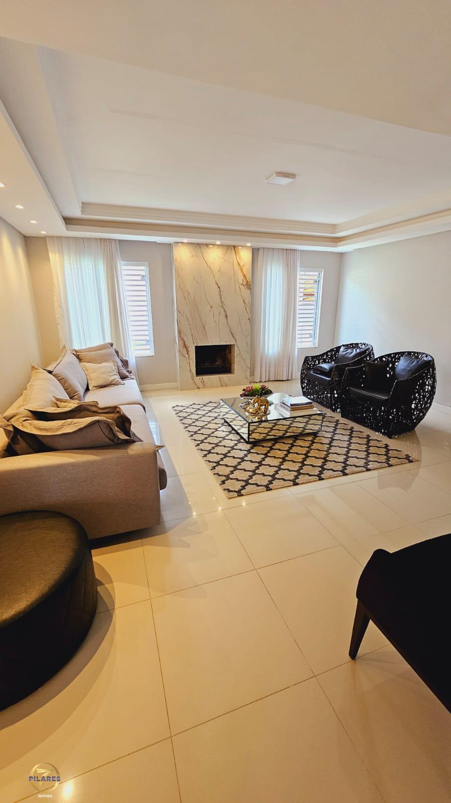No 2º Piso, ficam as 02 garagens cobertas, sala de estar com lareira, 03 suítes e varanda. No 1º Piso fica o living integrado, com sala de estar, jantar e cozinha, 01 suíte, home office, banheiro, área de serviço, espaço de festas com churrasqueira a carvão, sauna, piscina e espaço de jogos