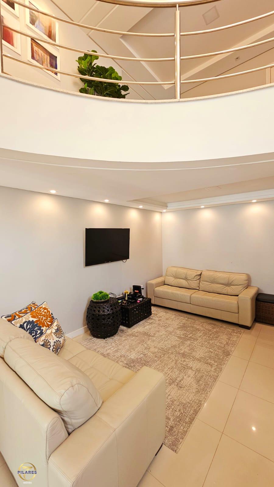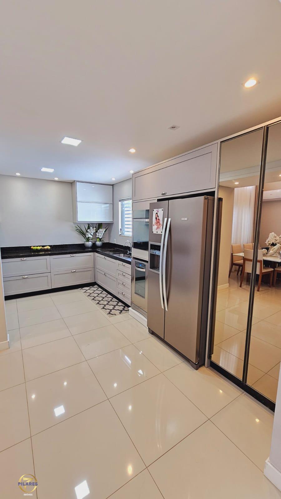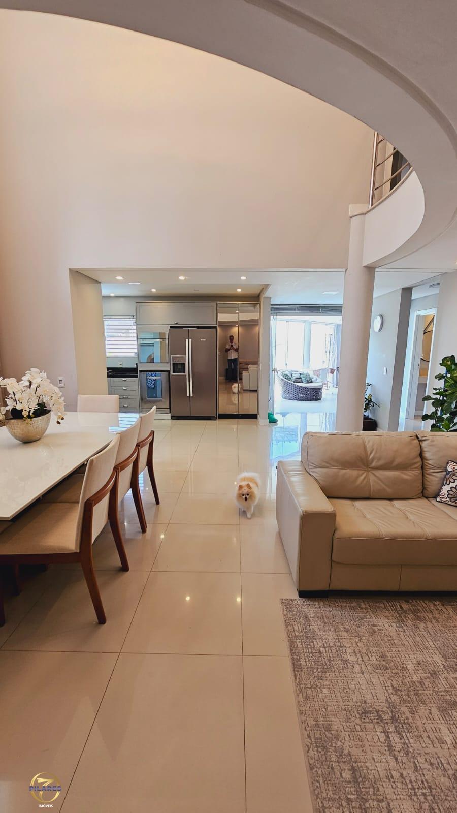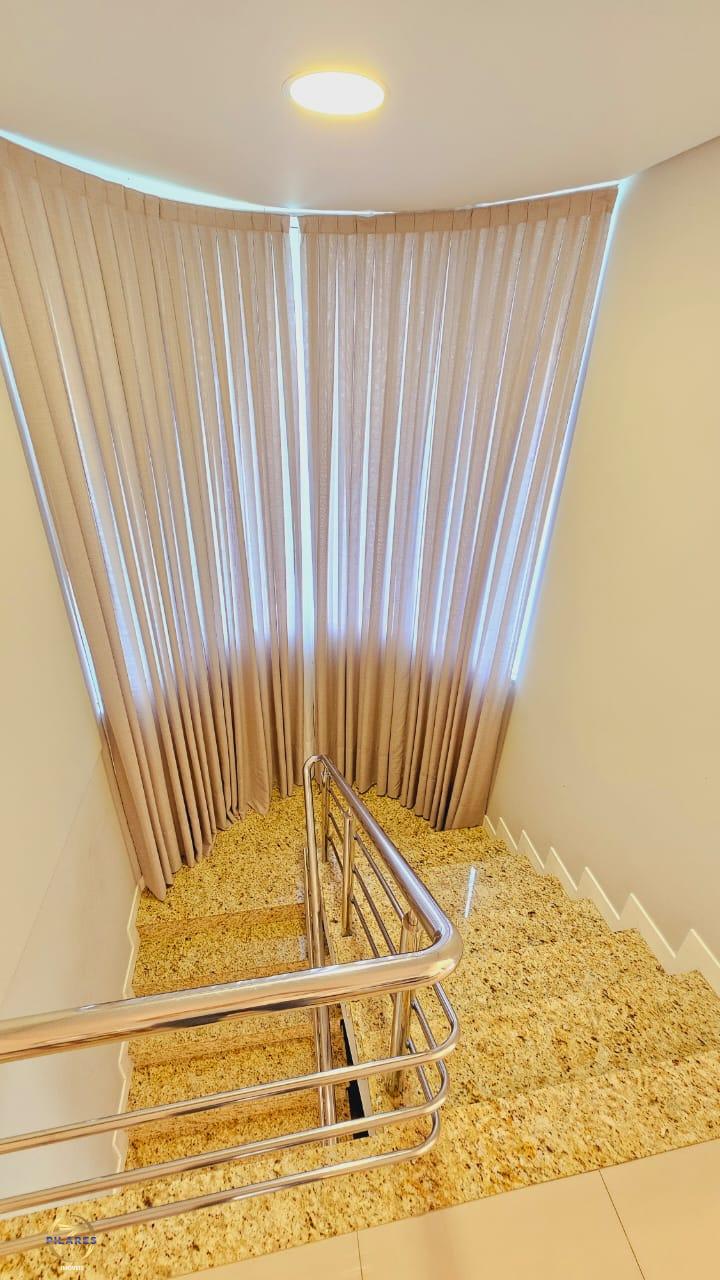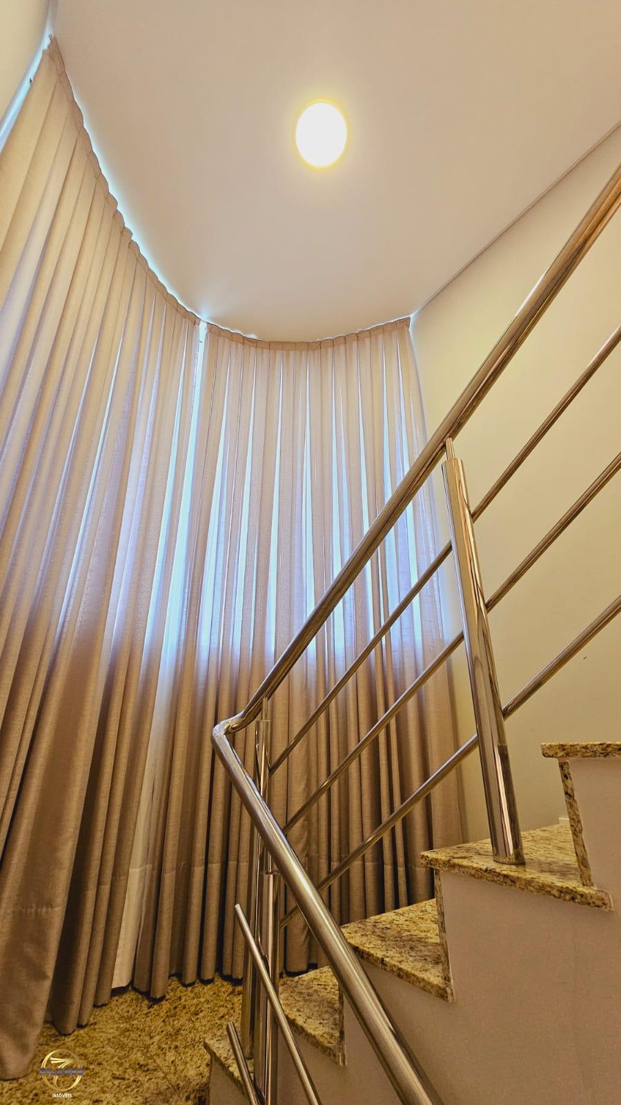 No 2º Piso, ficam as 02 garagens cobertas, sala de estar com lareira, 03 suítes e varanda. No 1º Piso fica o living integrado, com sala de estar, jantar e cozinha, 01 suíte, home office, banheiro, área de serviço, espaço de festas com churrasqueira a carvão, sauna, piscina e espaço de jogos